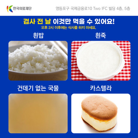 (1) 아침, 점심: 반찬 없이 흰쌀 죽을 먹도록 해요. 차후 검사 당일까지 장정결제와 물 이외 흡수하 않아도 되도록 합니다.