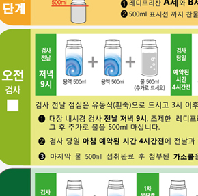검사 시간이 오전이냐 오후냐에 따라 장 세척제를 복용해야만 하는 시간도 달라져요. 따라서 검사에 맞춰 정해진 장 세척제를 복용 시간을 철두철미하게 지키는 것 또한 상당히 중요하죠.