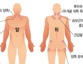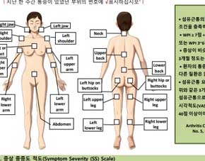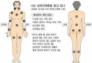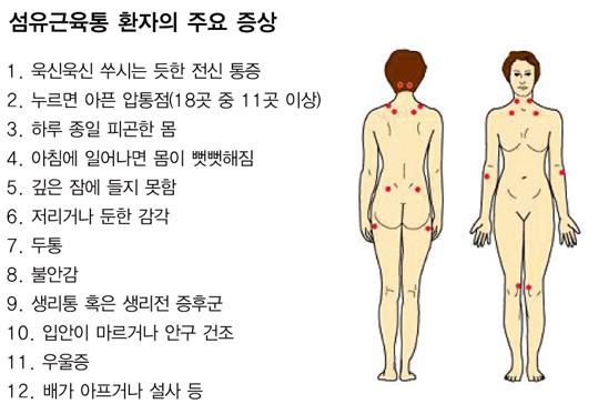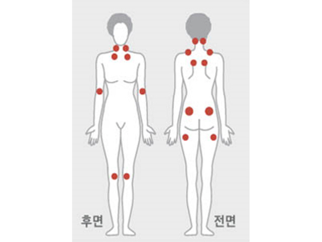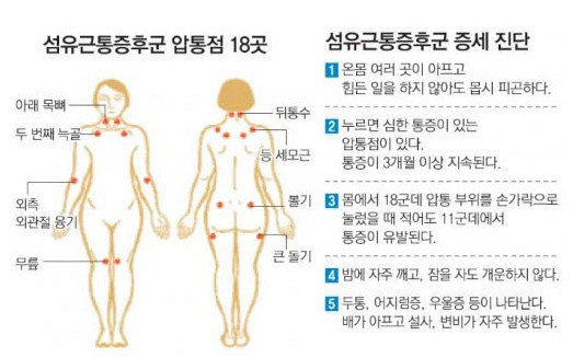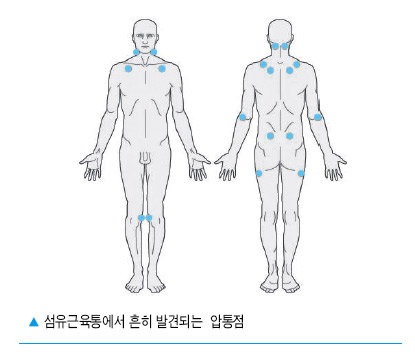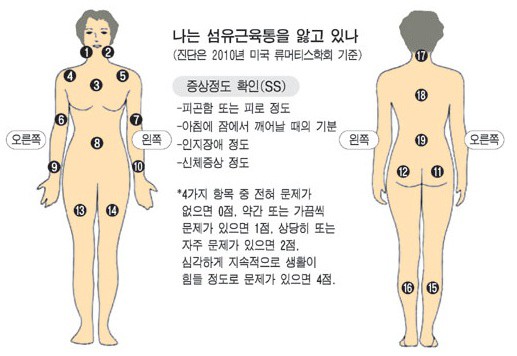 의사가 환자를 진료할 때 섬유근통 여부를 확고하게 진단하는 방법은 아래와같다고 합니다 3개월 이상 전신 근골격계 통증을 호소하며 진찰 시 18개 특정 인체부위 중 11곳 이상에서 유의한 압통을 호소하게 되었다면 '섬유근통'으로 진단하더라고요.