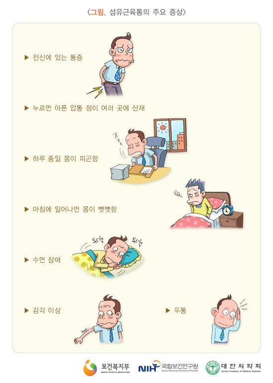 쉽게 풀이하자면 정확하게 어디가 아프다고 하기 어려운, 그것이야말로 이곳저곳에 만성통증이 일어나는는게었어요. 통증은 물론이고 경직감이 동반되기도 하고 수면장애, 불면증, 피로감 등이 느껴지기도 했어요.