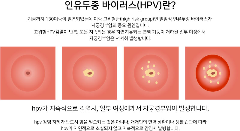 자궁경부암의 발생에 있어서 제일 귀중한 역할을 해서는 인유두종바이러스 감염입니다. 이는 성관계를 통해 매개되고, 고위험군 바이러스와 저 위험군 바이러스로 분파할 수 있습니다. 대다수는 저 위험군 바이러스로 일과성 감염으로 시간이 지나면 마이너스되는 경우가 크지만, 일부의 고위험군 바이러스의 경우에는 꾸준한 감염상태를 유지하여 자궁경부암을 유발시키는 것으로 알려져 있습니다.