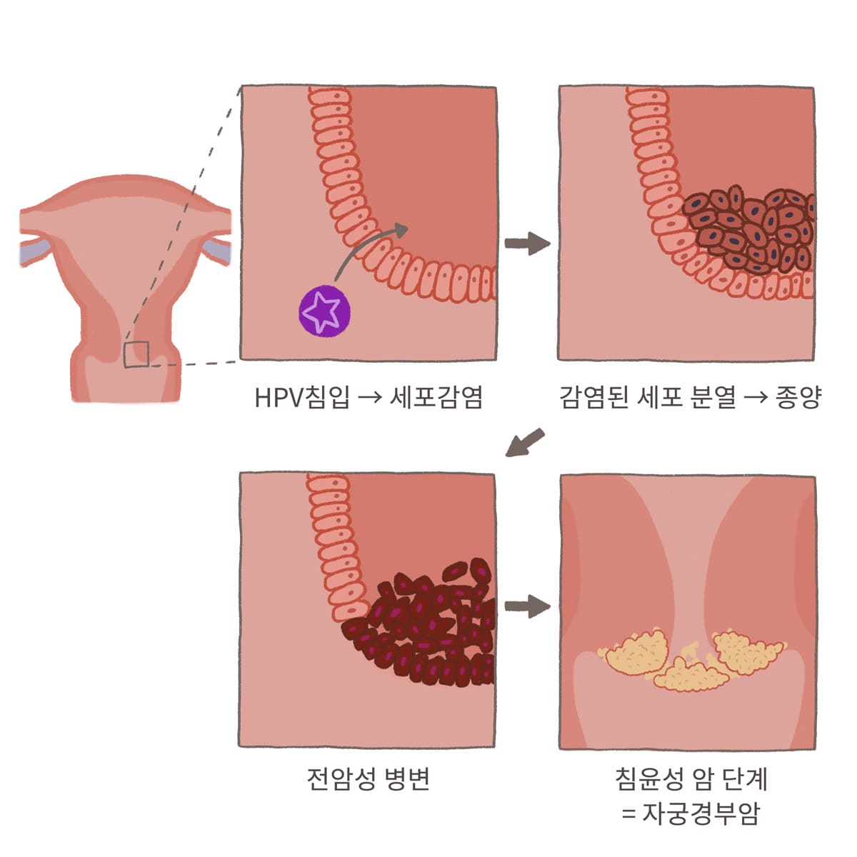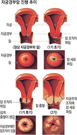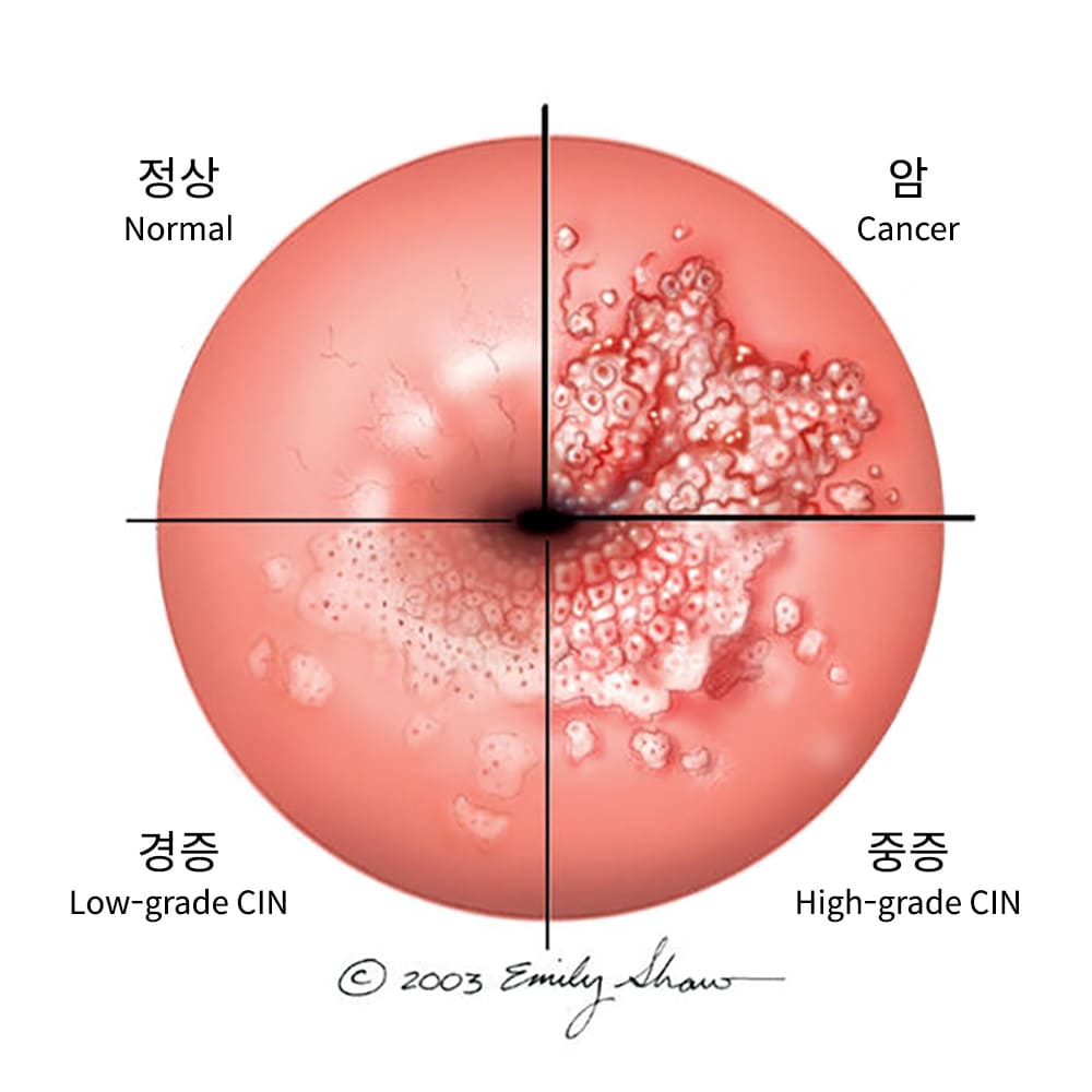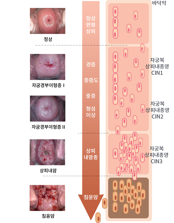 자궁경부 표면의 정상 상피세포에서 개시하여 상피 내이 형성증으로 진행하게 되고 이 궤도에서 치료하지 못하면 침윤성 자궁경부암으로 진행하게 되고요. 이 궤도은 수년 또는 수십 년에 걸쳐 천천히 진행되고요.