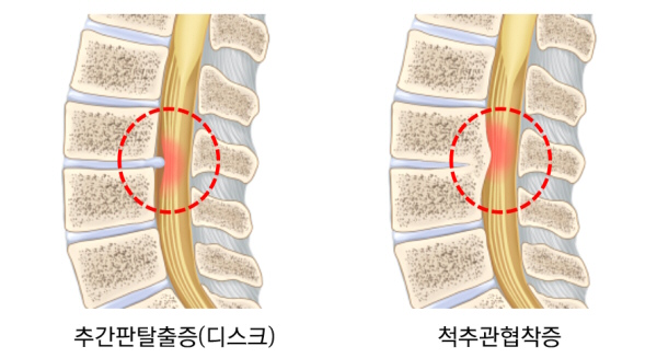 요통과 하지통을 함께 나타나기로 허리디스크(요추 추간판 탈출증)와 혼동되기도 하지만 몇 가지 증상에서 두 질환 간의 명료한 차이가 존재하여서 구분하는데 곤경은 없답니다.