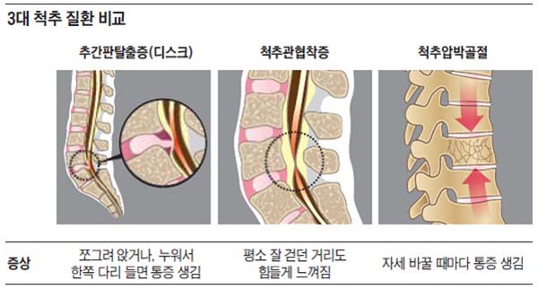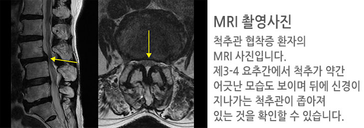 허리 디스크와는차이나게 척추관 협착증은 요통보다는 다리 저림이나 당김 증상이 있어, 보행에 제일 큰 고충을 체감할 수 있습니다. 때문에 오래 걷기가 힘들고 오래 걷지 않았음에도 자꾸 주저앉게 되는 성향이 존재하는데 표준적인 협착증의 증상이라 할 수 있습니다. 기본적으로 요추부(허리)의 문제이긴 하지만 허리디스크와 다르게 허리 통증이 한결같이 동반되지는 않으며, 있더라도 허리디스크에 대조해서 적은 정도의 통증이 일어납니다.