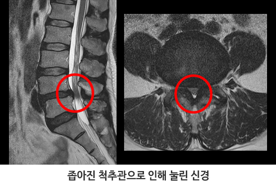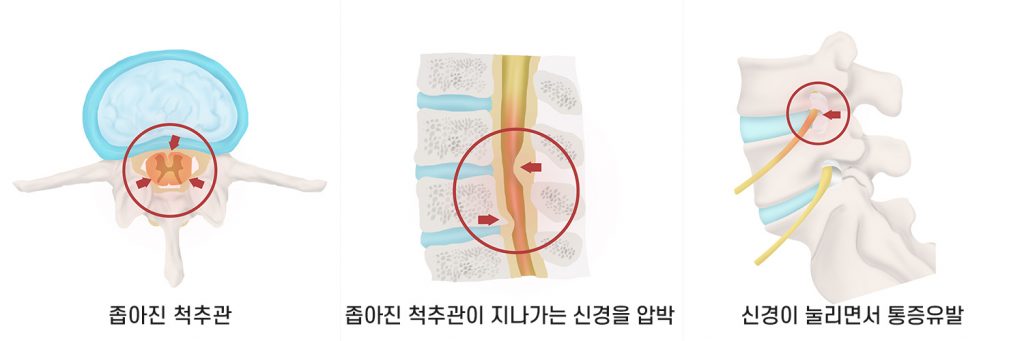 최고 많이 보이는 원인으로 척추 퇴행성 골관절염이 생김에 따라 허리 관절의 정도가 많아지고 인대도 두꺼워지는 더불어 가시 같은 뼈가 자라나 신경 길을 좁아지게 해요.