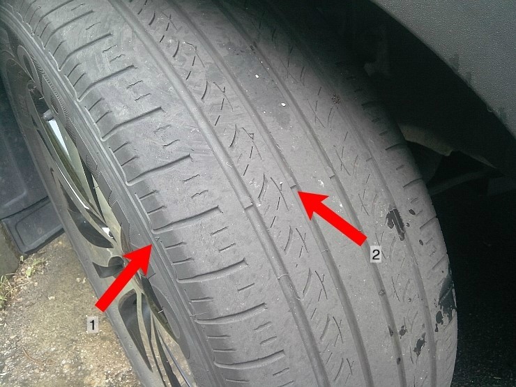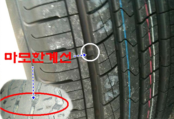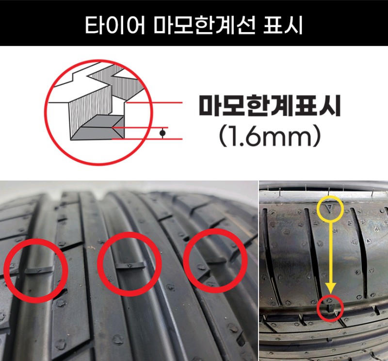 타이어 홈의 마모한계선은 대개 1.6mm이고, 마모된 타이어는 마모한계선과 높이가 비슷한 경우 혹은 그것보다 높게 표기됩니다.