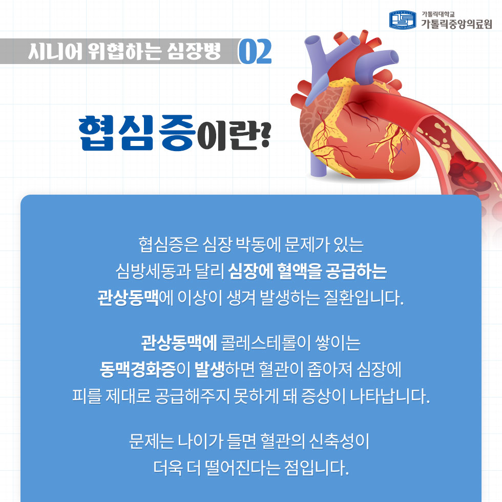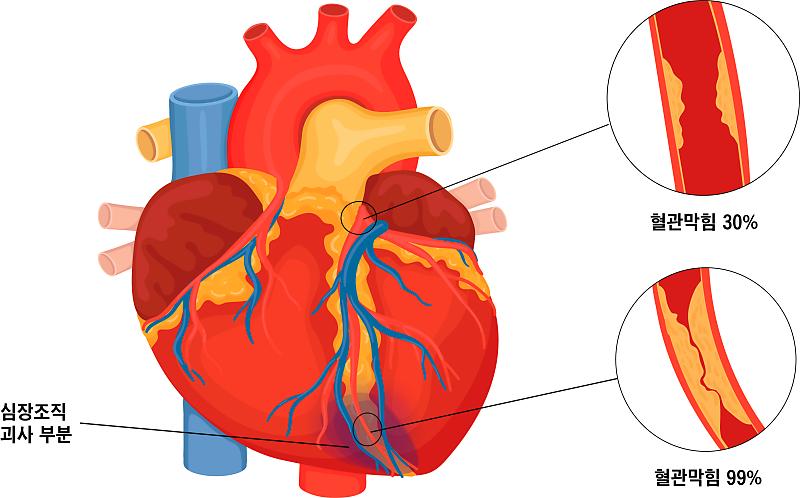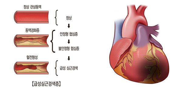 협심증은 심장으로 혈액을 급부하는 혈관인 관상동맥이 동맥경화증, 혈전증, 혈관 수축 등의 원인으로 혈관이 좁아져서 생기는 질환이고요. 관상 동맥 내의 동맥 경화성의 변화는 20대 초반부터 진행될 수 있고 혈관 면적의 70% 이상이 좁아지면 심장의 전체 또는 일부에 혈류 공급이 감량하게면서 산소와 영양 공급이 감량하게 되어 심장근육이 허혈 상태에 빠지게 됩니다. 이런 현상이 바로 협심증입니다.