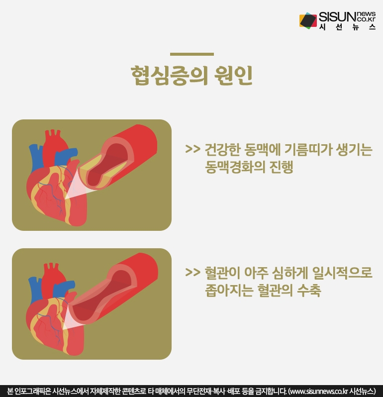 협심증은 심장에 혈액을 주는 혈관(관상동맥)이 좁아지거나 막혀 심장근육(심근)이 조르는 것보다 충분하지 못한 양의 산소가 심근에 공급됨으로써 생기게 되며 협심증의 가지 수에 따라 원인이 천천히 다르다고 해요.