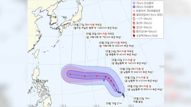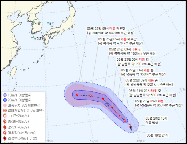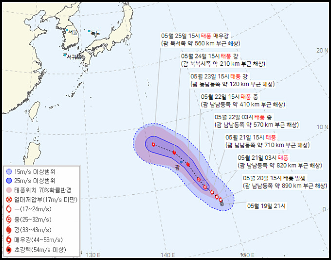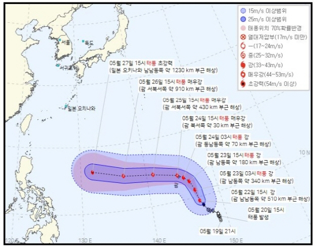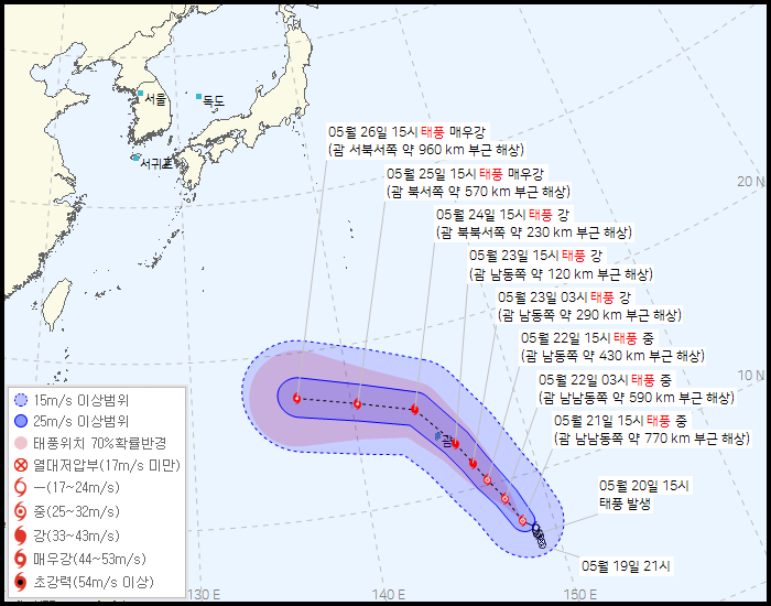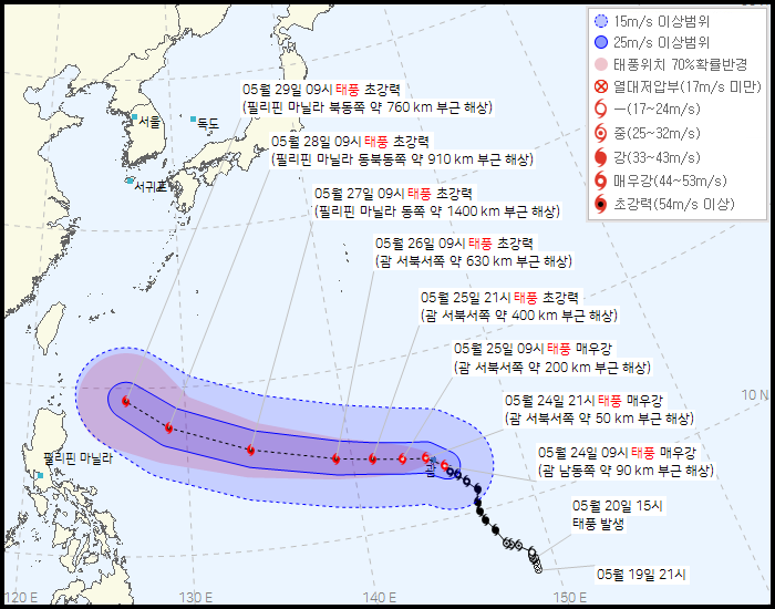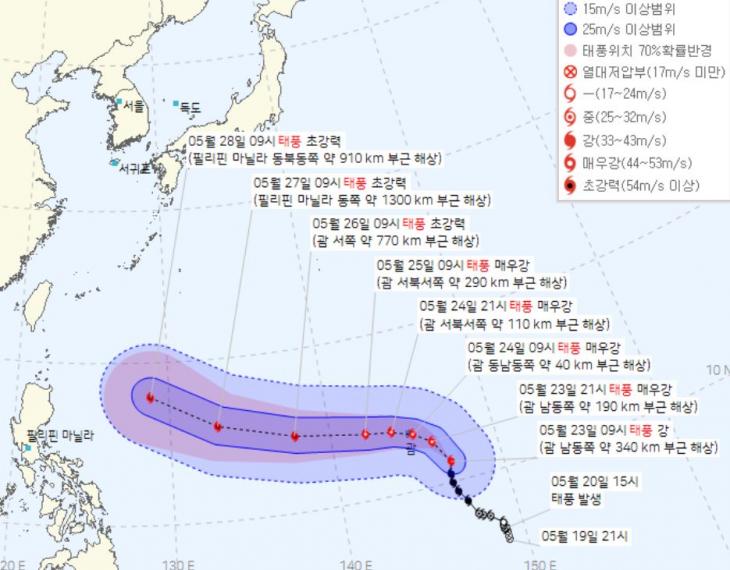 대한민국 기상청에 기초하면 2023년 5월 23일 오후 4시 업데이트한 태풍 마와르 예상경로에 기초하면 이날 오후 3시 현재 태풍 마와르는 괌 남동쪽 260km 해상에 자리잡고 있다며 강도는 상당히 강할 것이라 하더라고요.