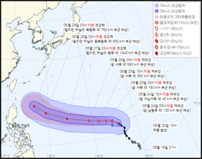 이와 동반해 현재 밟고 있는 필리핀행 서진 경로가 다시 북쪽으로 꺾이며 대만 동쪽 해상에 이어 일본 오키나와 군도를 따라가는 '북진' 및 '북동진' 경로가 예상하며 사실상 우리나라와 멀어지는듯하다 다시 가까워지는 수순도 전망되기도 합니다.